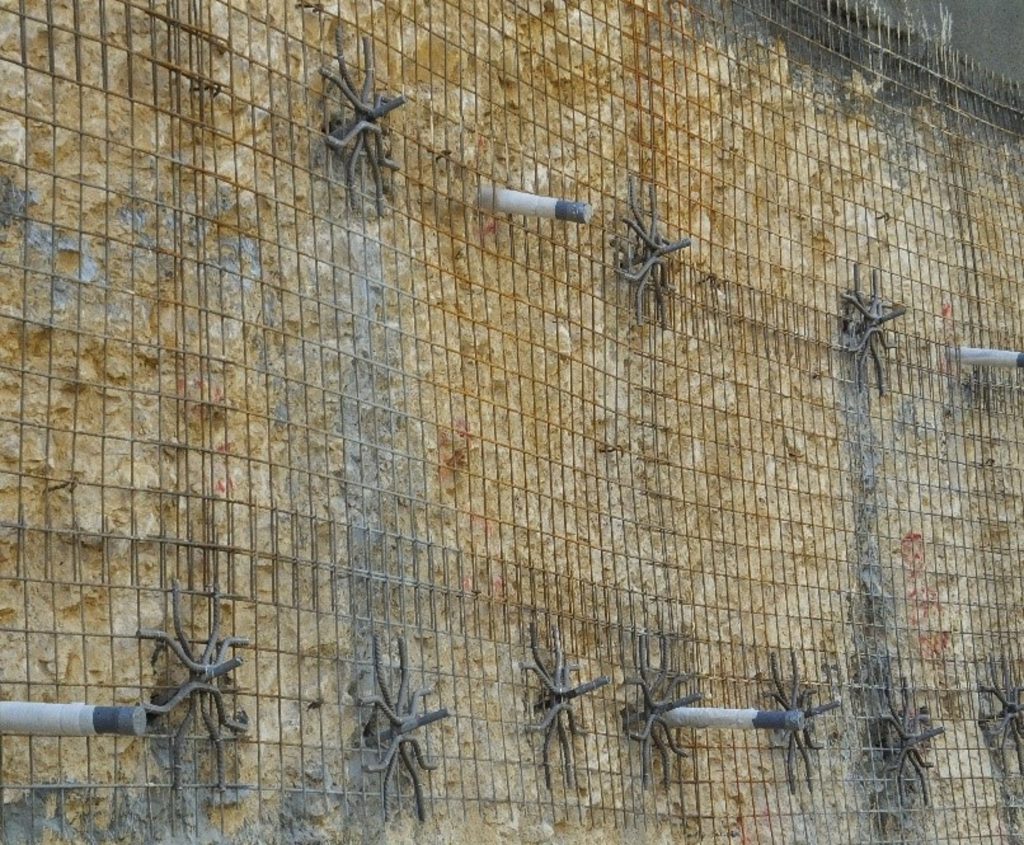 1- تركيب مسامير صخرية قصيرة الطول (تترواح بين 0.5 م الي 1 م) مسننة الطرف على الواجهة المراد تدعيمها