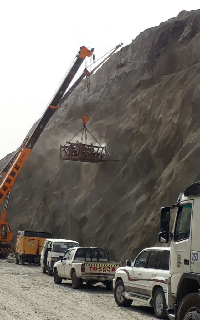 2- تركيب الشبك المعدني – ابعاد اللفة (4م× 20 م) ذو السماكة العالية والجهد العالي على الواجهة الصخرية ويتم تثبيته باستخدام المسامير المذكورة سابقا وباستخدام فلنجات وصواميل التثبيت.